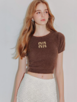 Fluffy Knit Short Sleeve Crop Top with AIR SPACE Logo Embroidered