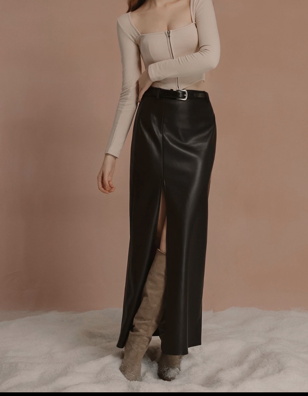 【Heat Tech】Faux Leather High Waist Front Slit Straight Maxi Skirt (with Belt)