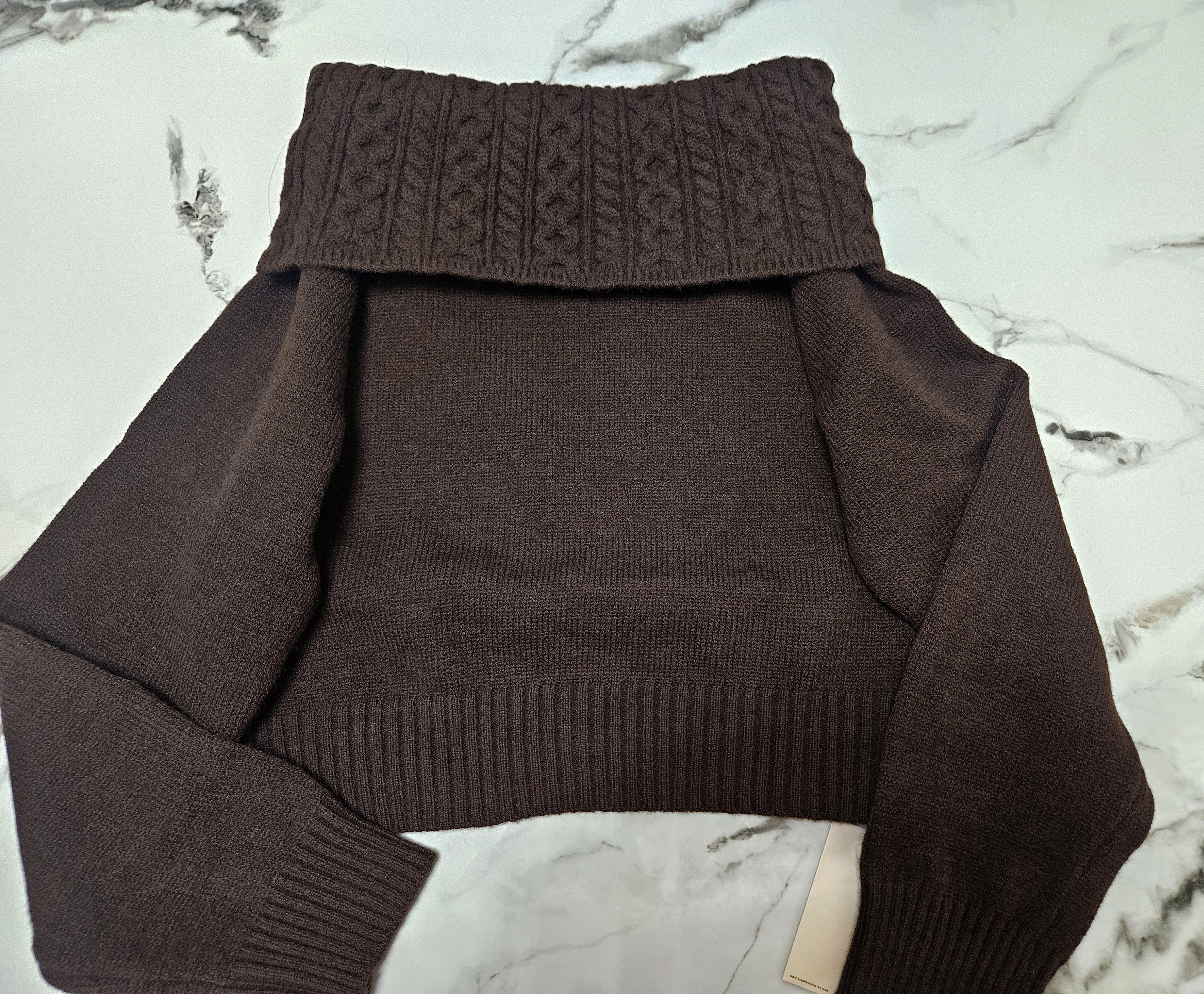 This knit top features a fold-over off-shoulder neckline that naturally highlights the shoulder line, paired with a slim knitted scarf for an added style accent. The cropped silhouette enhances lower-body proportions while keeping the overall look light and balanced. A distinctive yet easy-to-style knit piece for everyday wear.