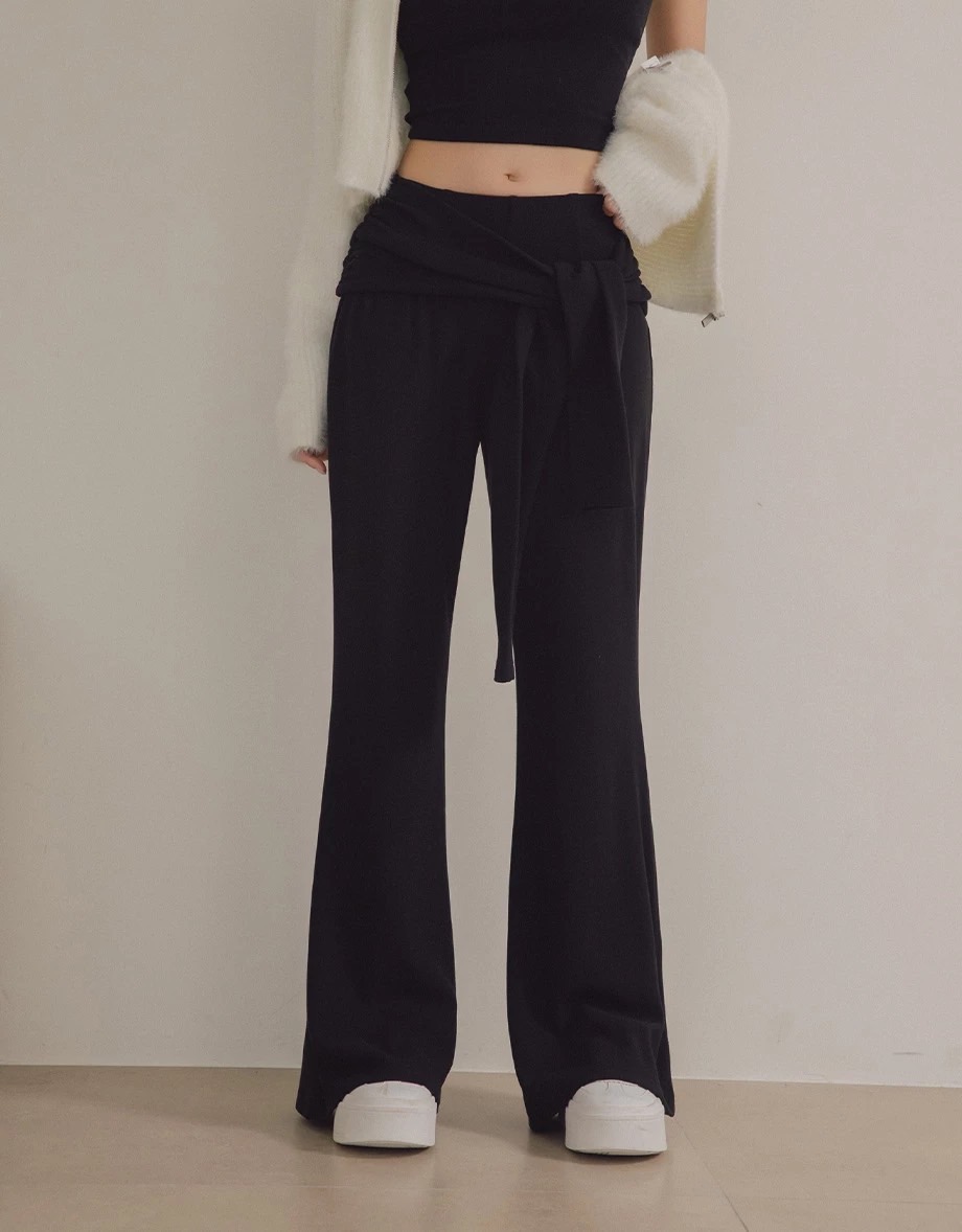 These velour-finish flared pants feature a soft, skin-friendly texture with stylish sleeve-tie details, creating a slim, elongated leg line with modern appeal. The subtle flare silhouette refines the legs, while the elastic waistband ensures comfortable, flexible wear for everyday styling with layered detail.