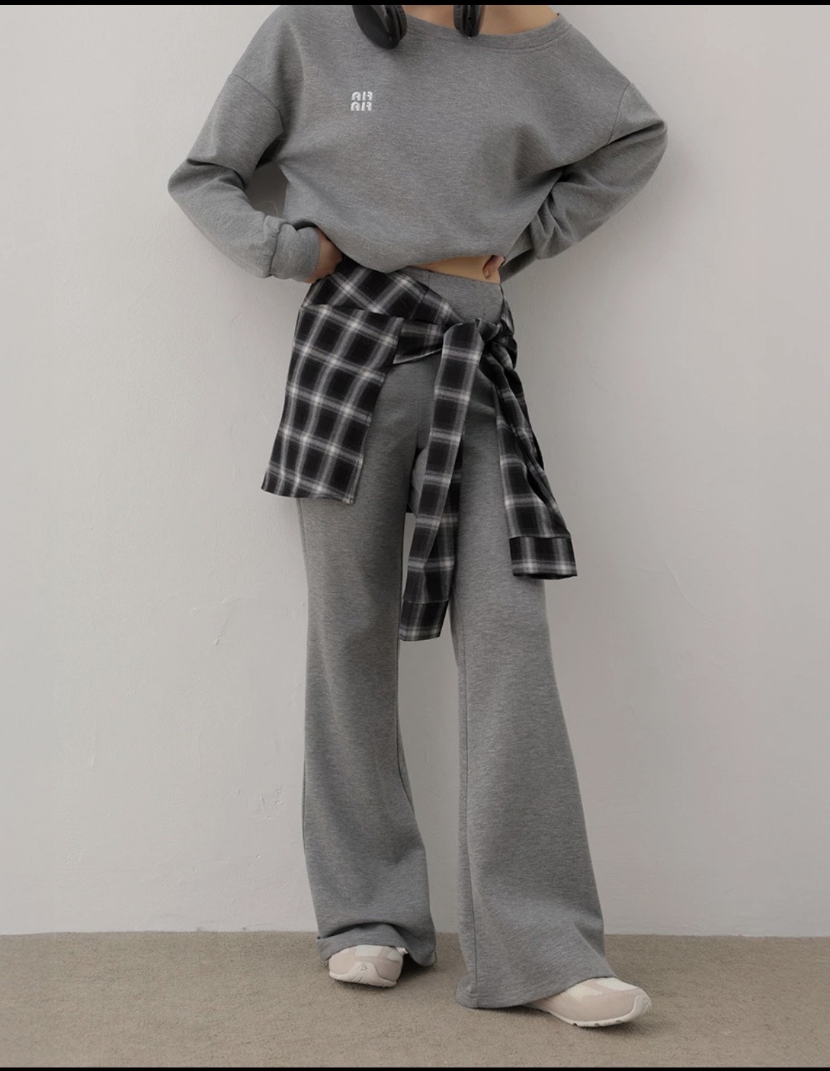 Flared Hem Mid Rise Trousers Pants (with Plaid Removable Waist Wrap Skirt)