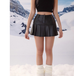 皮質面料外觀具備挺度與造型感,內層發熱纖維提供絕佳保暖度。拼接百褶裙襬設計感覺俐落可愛,短裙可修飾腿部比例。後腰鬆緊帶設計貼合腰身,穿著舒適無束縛感。