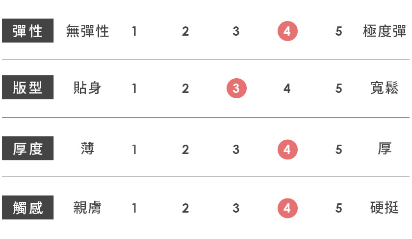 | 觸感 | 親膚 | 1 | 2 | 3 | 4 | 5 | 硬挺 |