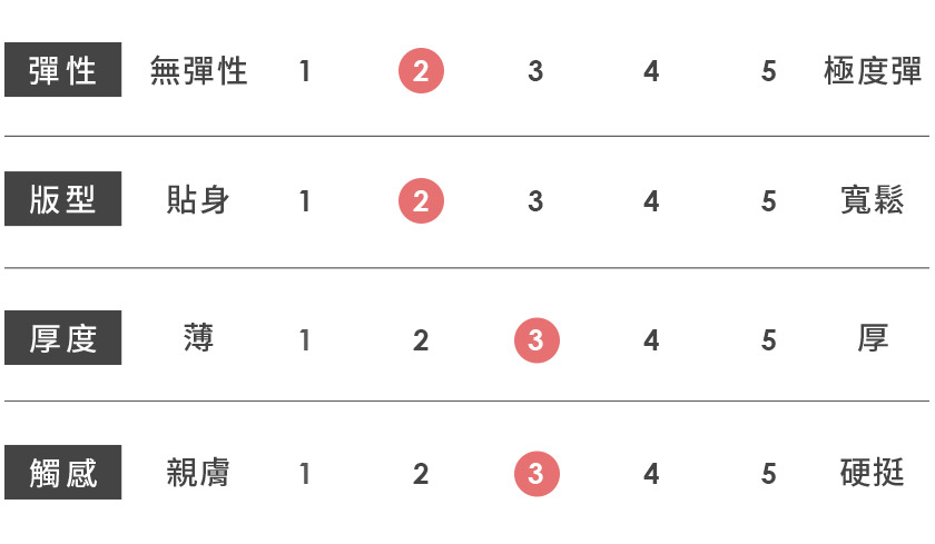 | 觸感 | 親膚 | 1 | 2 | 3 | 4 | 5 | 硬挺 |