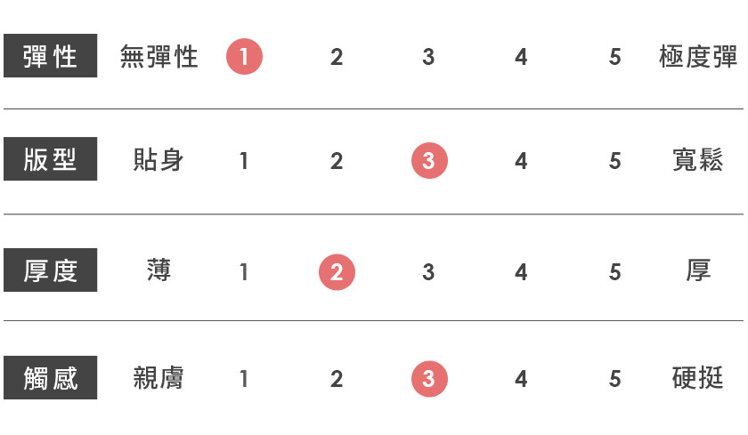 | 觸感 | 親膚 | 1 | 2 | 3 | 4 | 5 | 硬挺 |