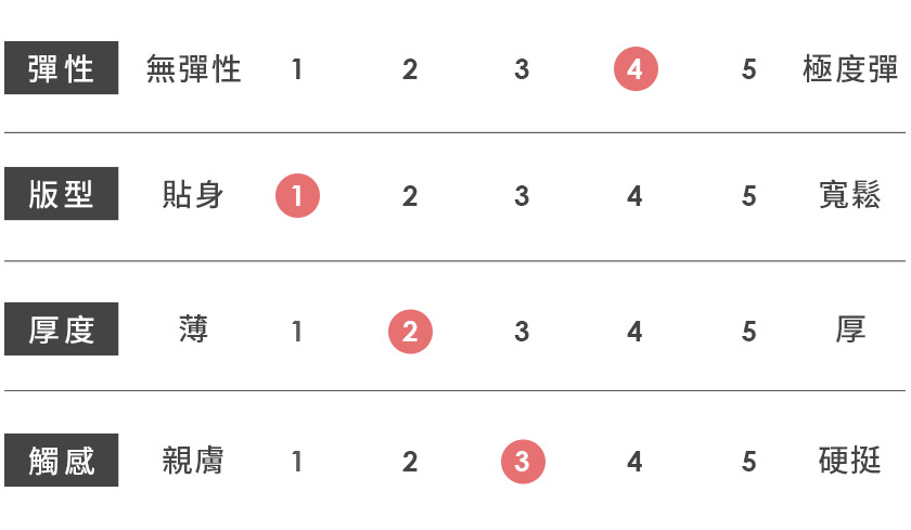 | 觸感 | 親膚 | 1 | 2 | 3 | 4 | 5 | 硬挺 |