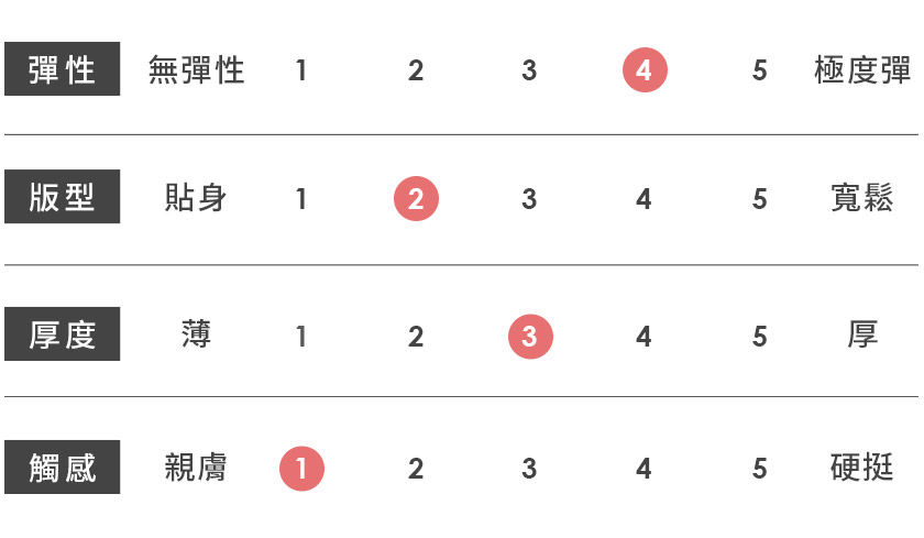 | 觸感 | 親膚 | 1 | 2 | 3 | 4 | 5 | 硬挺 |