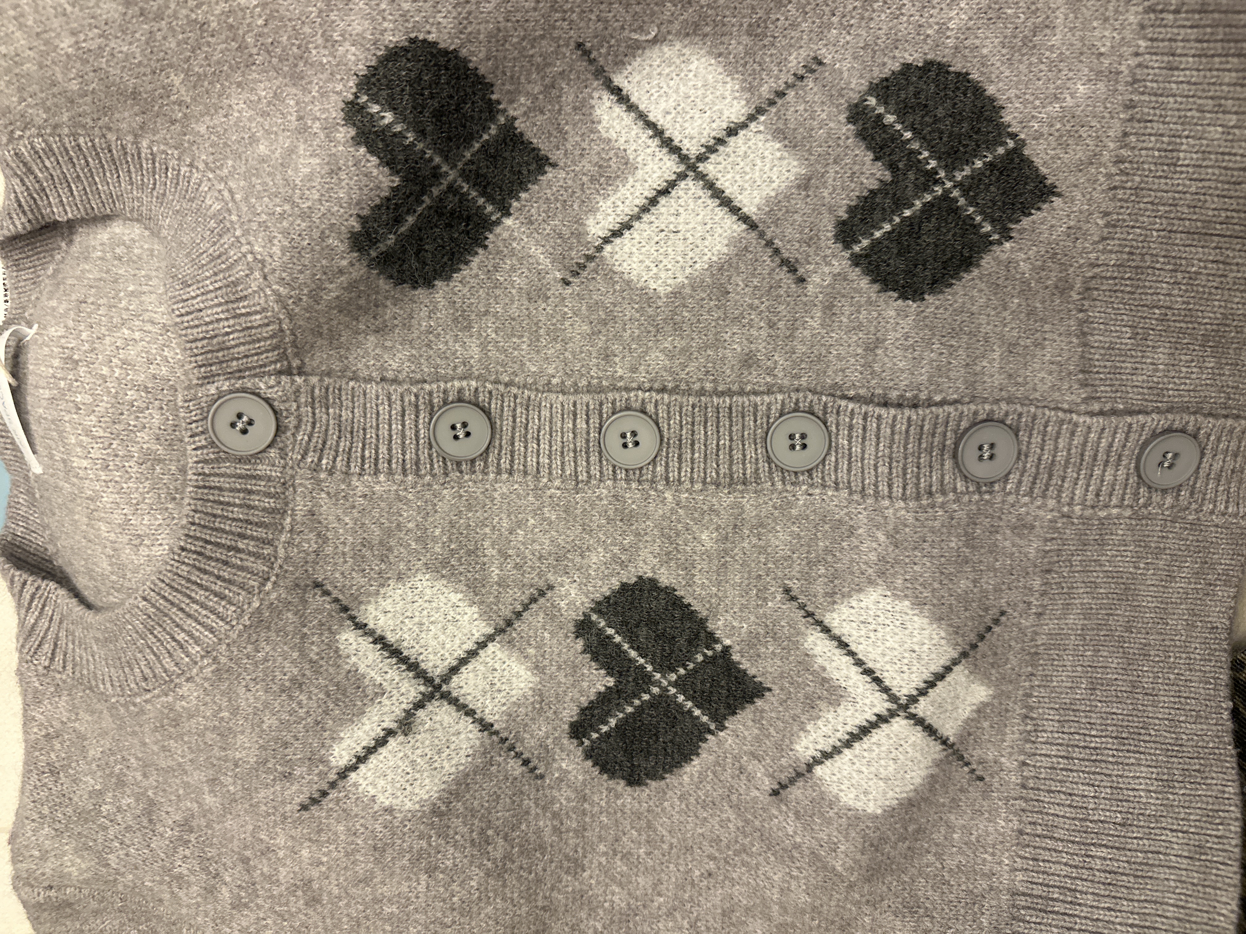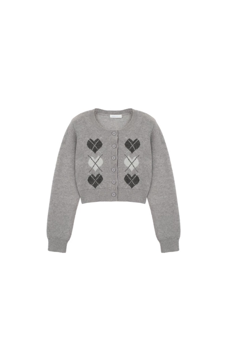 This knit cardigan features a playful heart argyle pattern that adds a charming, youthful touch. The soft knit texture feels smooth against the skin without irritation. Designed with a cropped, button-front silhouette, it helps balance proportions and pairs perfectly with skirts to create a chic, collegiate-inspired look.