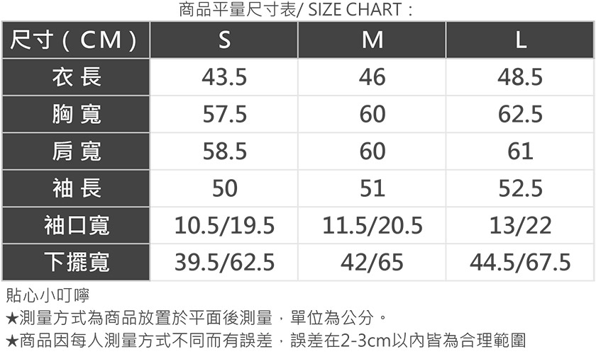 | 版型 | 貼身 | 1 | 2 | 3 | 4 | 5 | 寬鬆 |