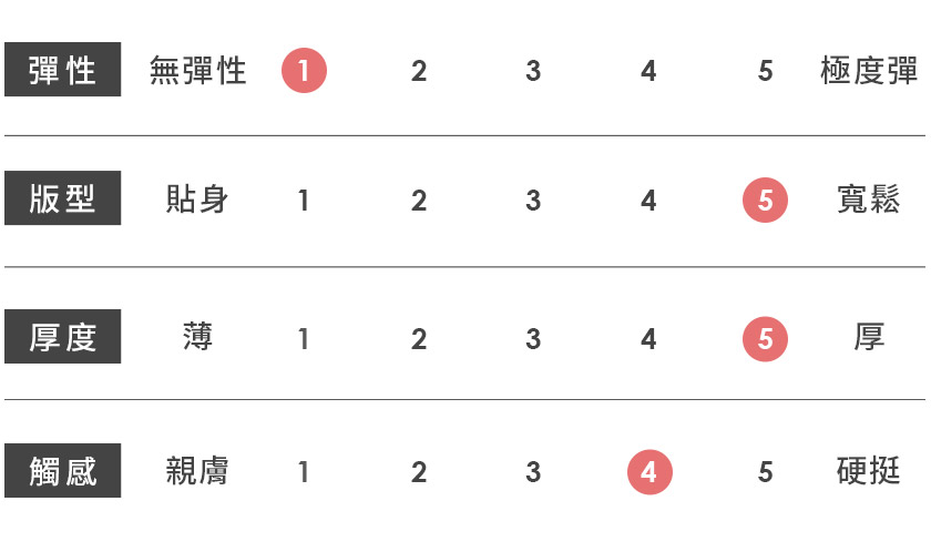 | 觸感 | 親膚 | 1 | 2 | 3 | 4 | 5 | 硬挺 |