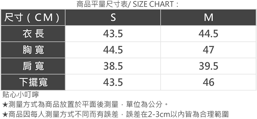 不確定自己的尺寸嗎?別擔心,我們幫你搞定。你可以參考下方商品評量尺寸表或是身材測量方式找到最適合你的尺碼,如果還有疑問也歡迎隨時聯繫我們的客服團隊。