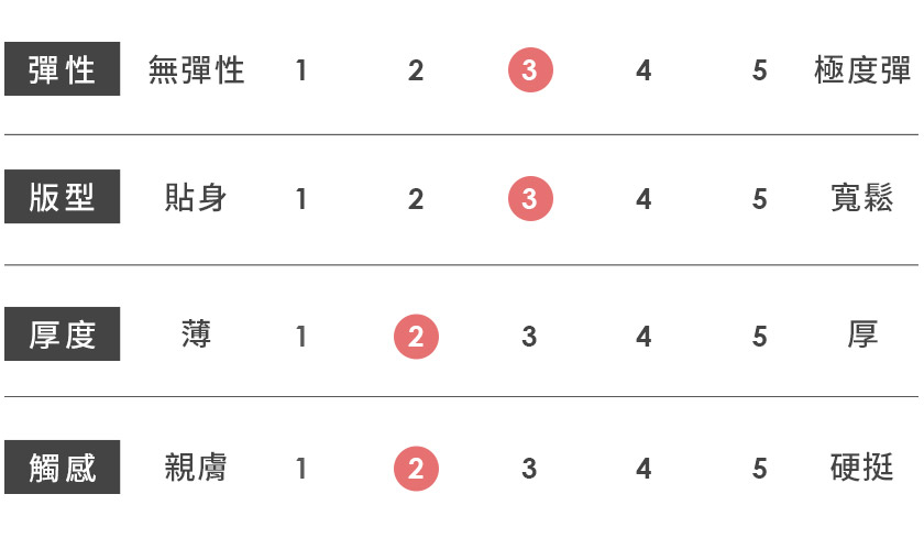 | 觸感 | 親膚 | 1 | 2 | 3 | 4 | 5 | 硬挺 |