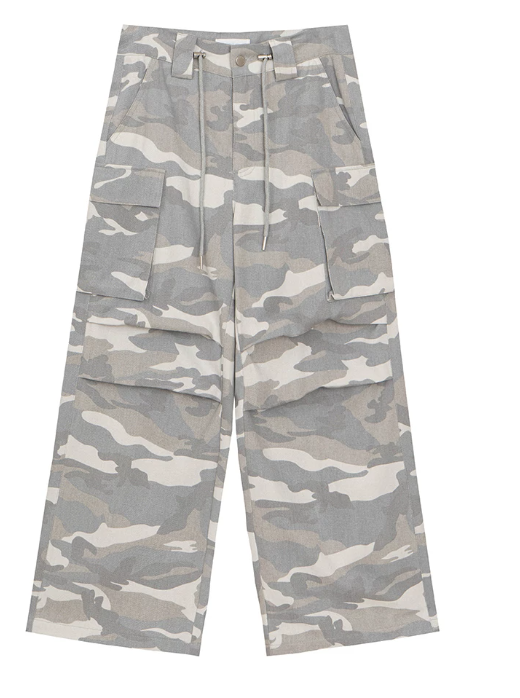 Drawstring Waist Wide Leg Cargo Pants (Camo Print/Leopard Print)