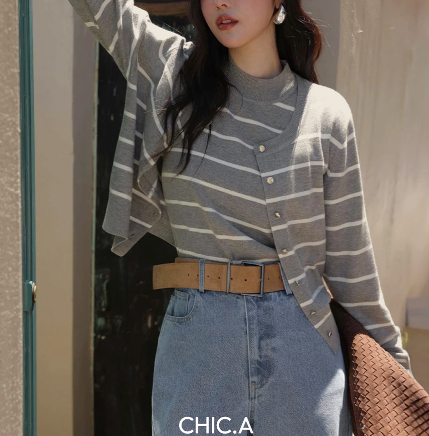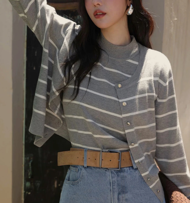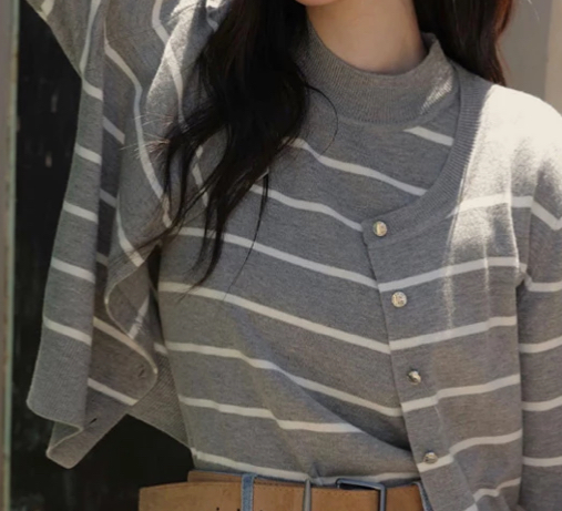 立領背心金屬排扣開襟針織衫套裝(素色/條紋)