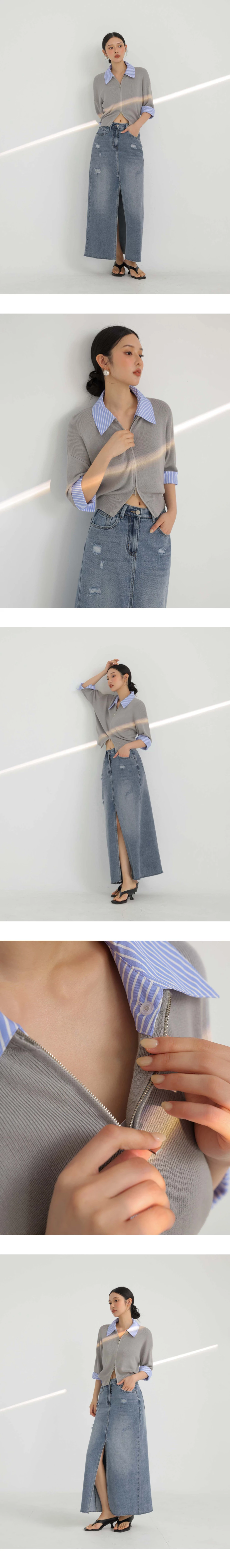 2WAY假兩件條紋翻領五分拼接袖拉鍊開襟針織衫