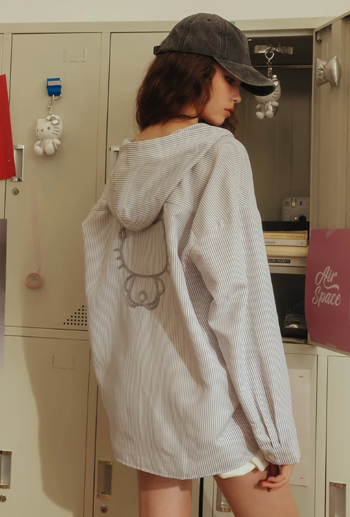 【SANRIO Collab】Hello Kitty Striped Button Up Hooded Shirt Blouse