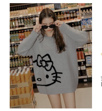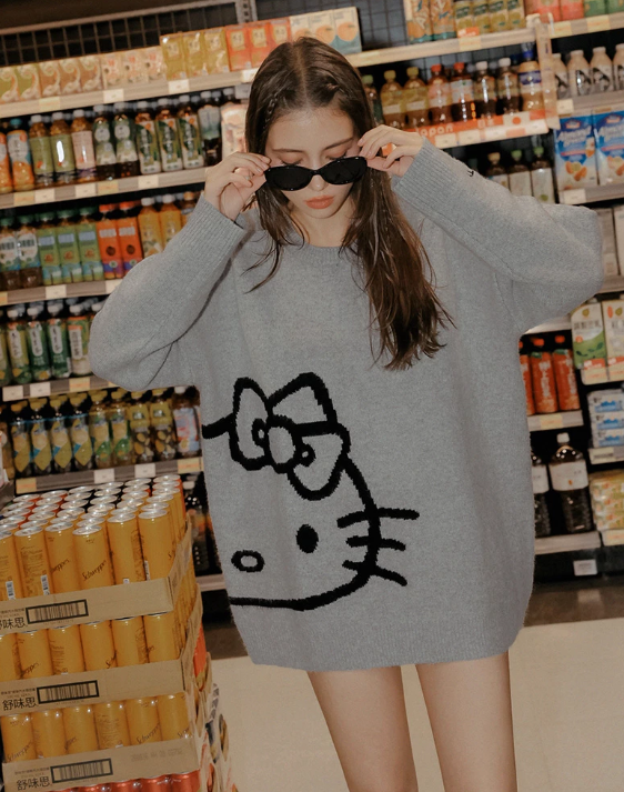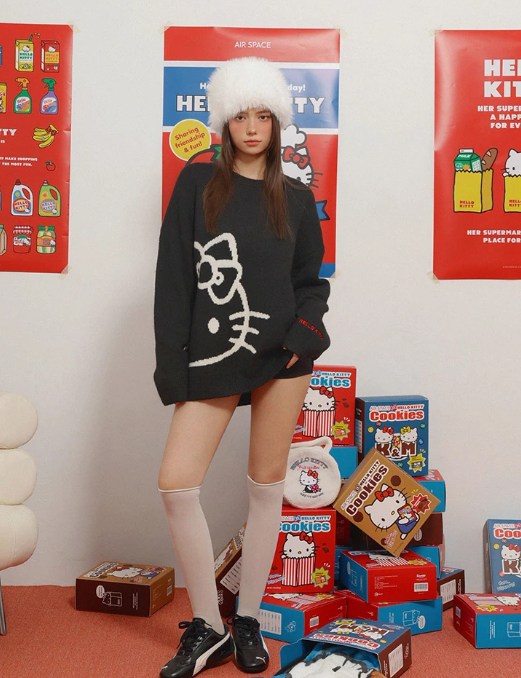 【Hello Kitty Collaboration】Oversized Knit Pullover Sweater with Kitty Outline