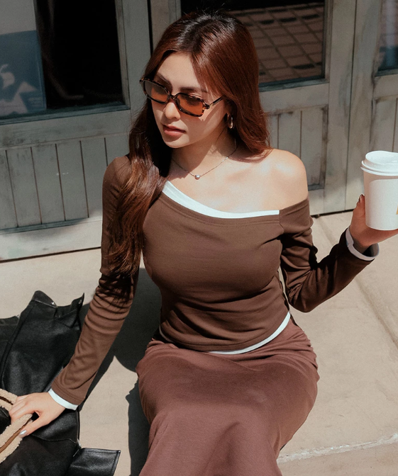 Faux 2 Piece Contrast Trim Off Shoulder Knit Long Sleeve Padded Bra Top