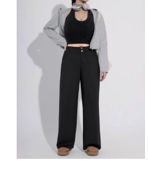 Crafted from an air-layer fabric that feels soft against the skin, offers gentle stretch, and remains breathable, this piece delivers outstanding comfort with a structured knit that resists wrinkling. The double-button waistband visually elongates the proportions, while the straight wide-leg cut smooths the leg line without emphasizing the hips, creating a flattering, long-legged silhouette with a defined waist.