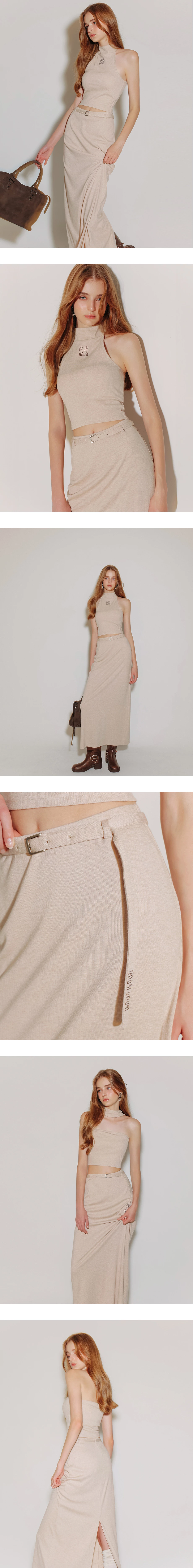 後開衩鬆緊直筒長裙(附品牌LOGO刺繡腰帶)