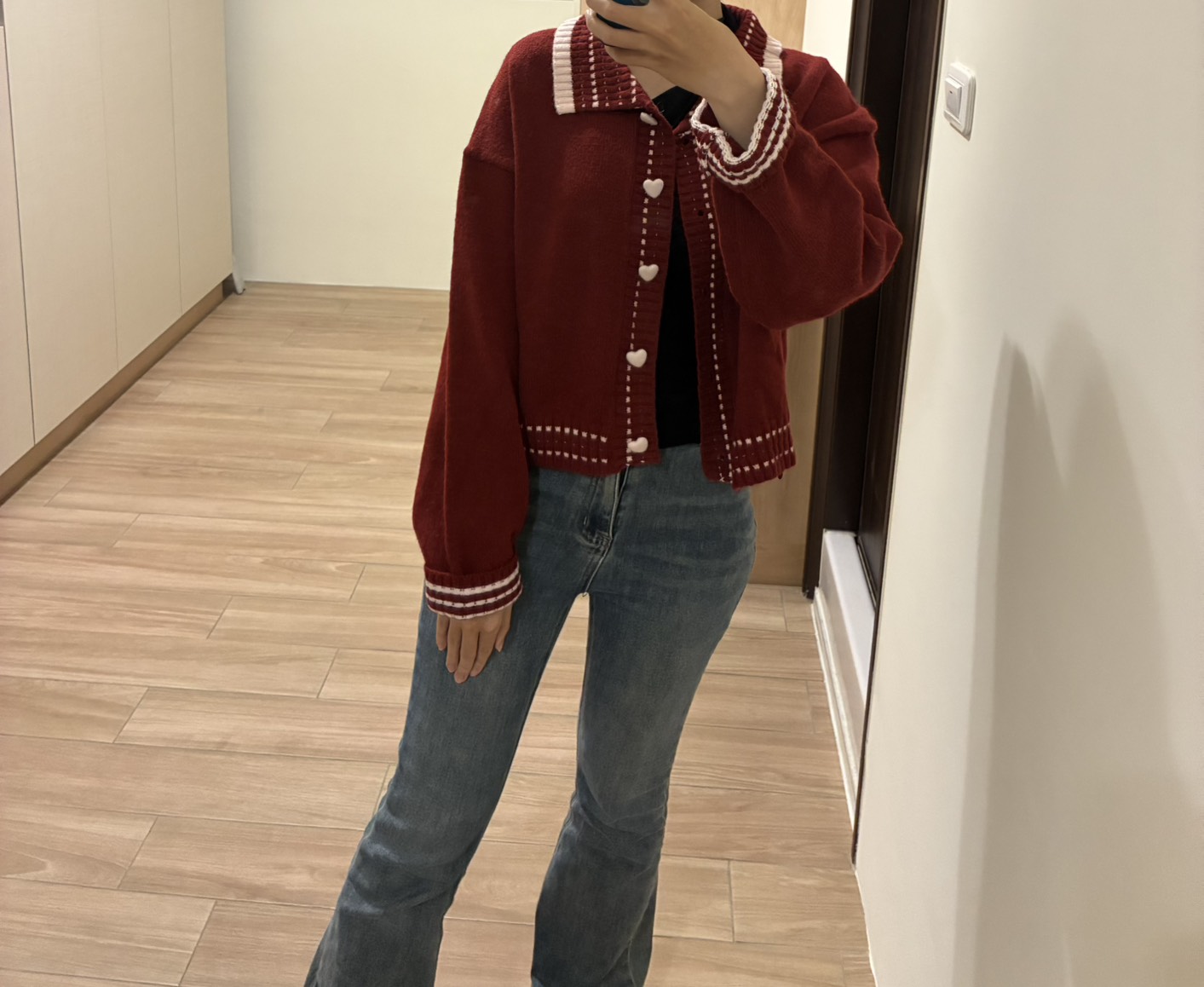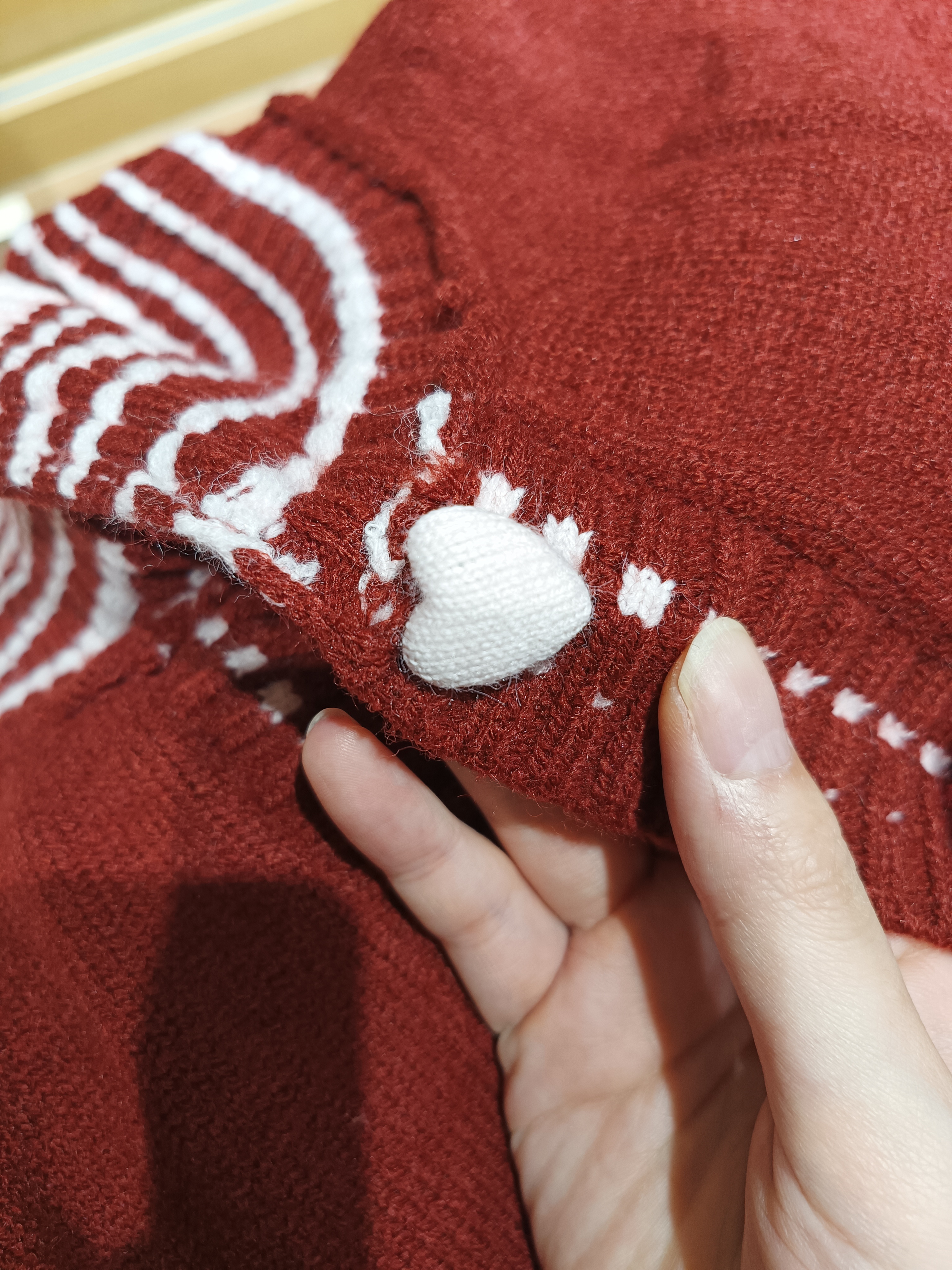很可愛的外套,快過年了就是要買紅色衣服,愛心鈕扣是針織包裹的使用上要小心
