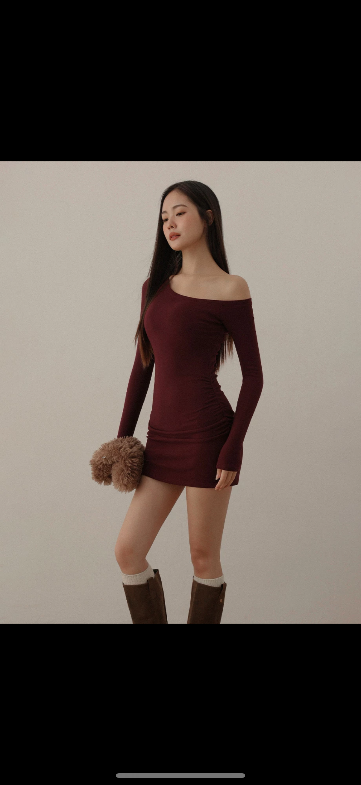 This asymmetrical slanted neckline softly reveals the shoulder and neckline, creating a naturally sensual look. The brushed fabric feels smooth and delicate against the skin while maintaining warmth and comfort. Built-in bra pads eliminate the need for additional layering. The mini dress length enhances leg proportions, highlighting a distinctly feminine silhouette.