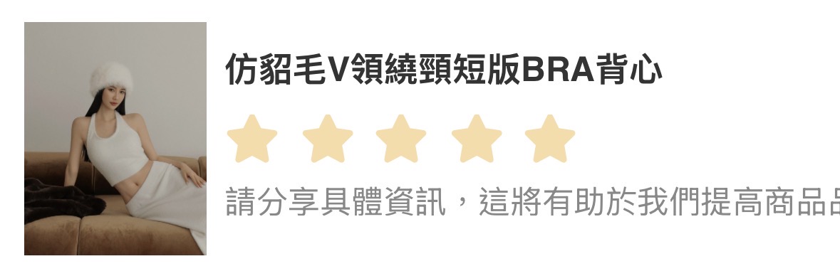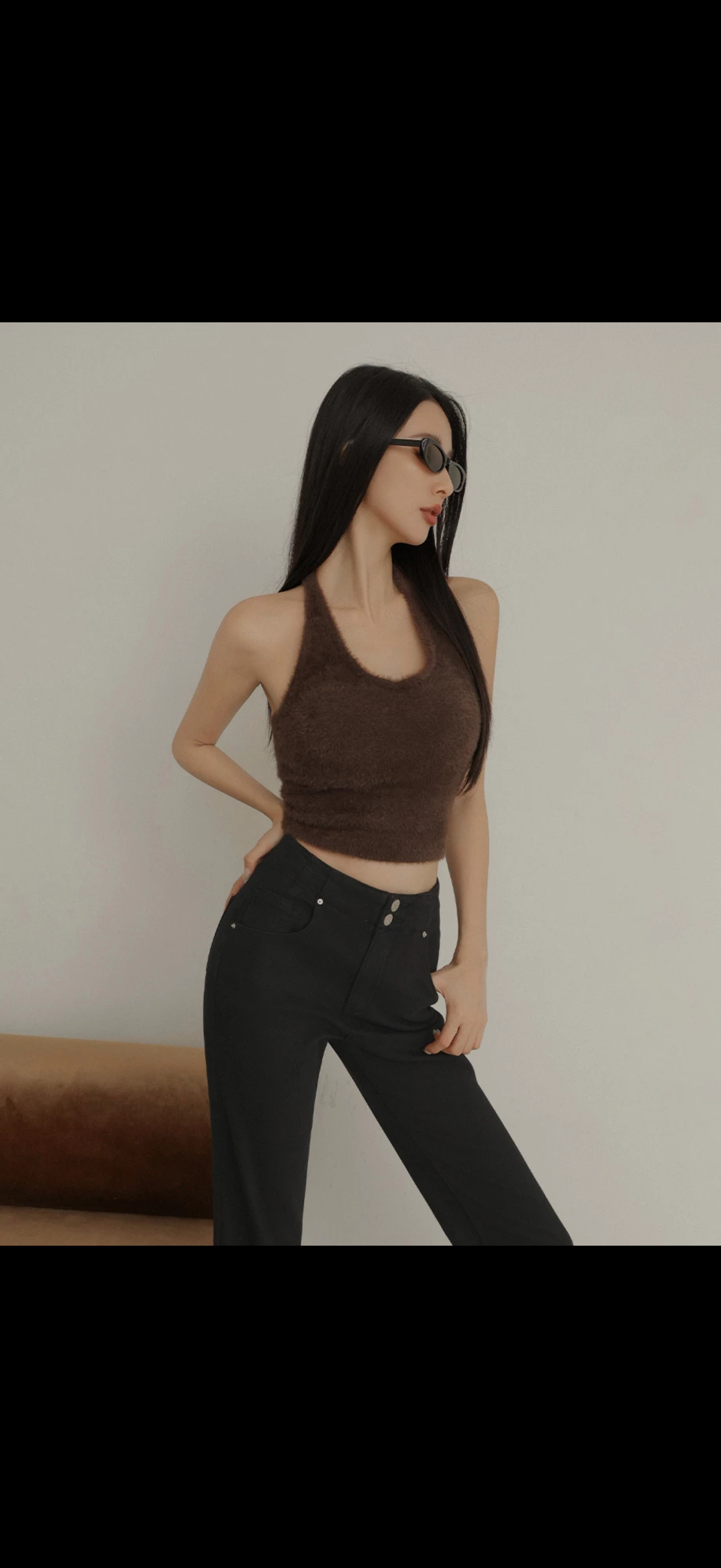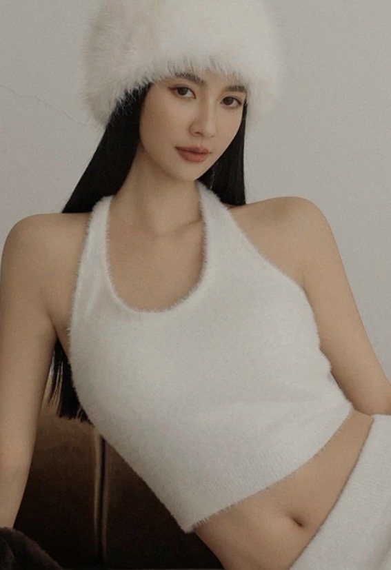 仿貂毛布料質感細緻,親膚不刺癢。V 領結合繞頸設計修飾肩頸線條,短版樣式小露纖腰,單穿或內搭都可展現不費力的性感魅力。