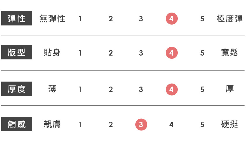 | 觸感 | 親膚 | 1 | 2 | 3 | 4 | 5 | 硬挺 |