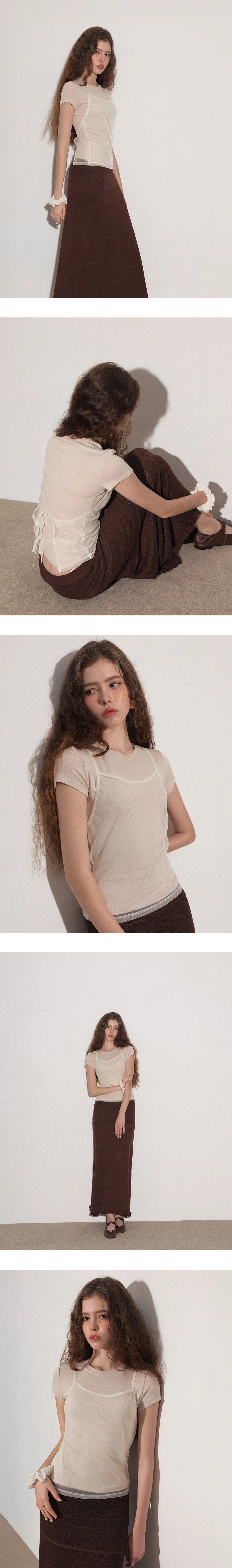 假兩件透紗後綁帶背心圓領羅紋短袖TEE