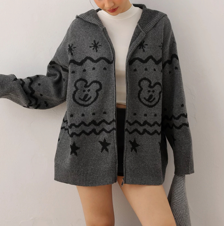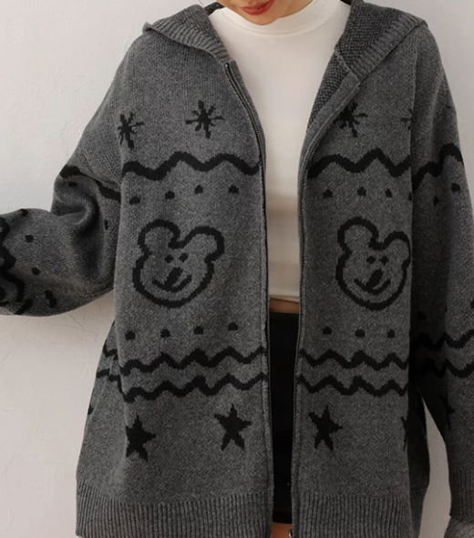 【DINOTAENG】Knit Pattern Hooded Cardigan Jacket