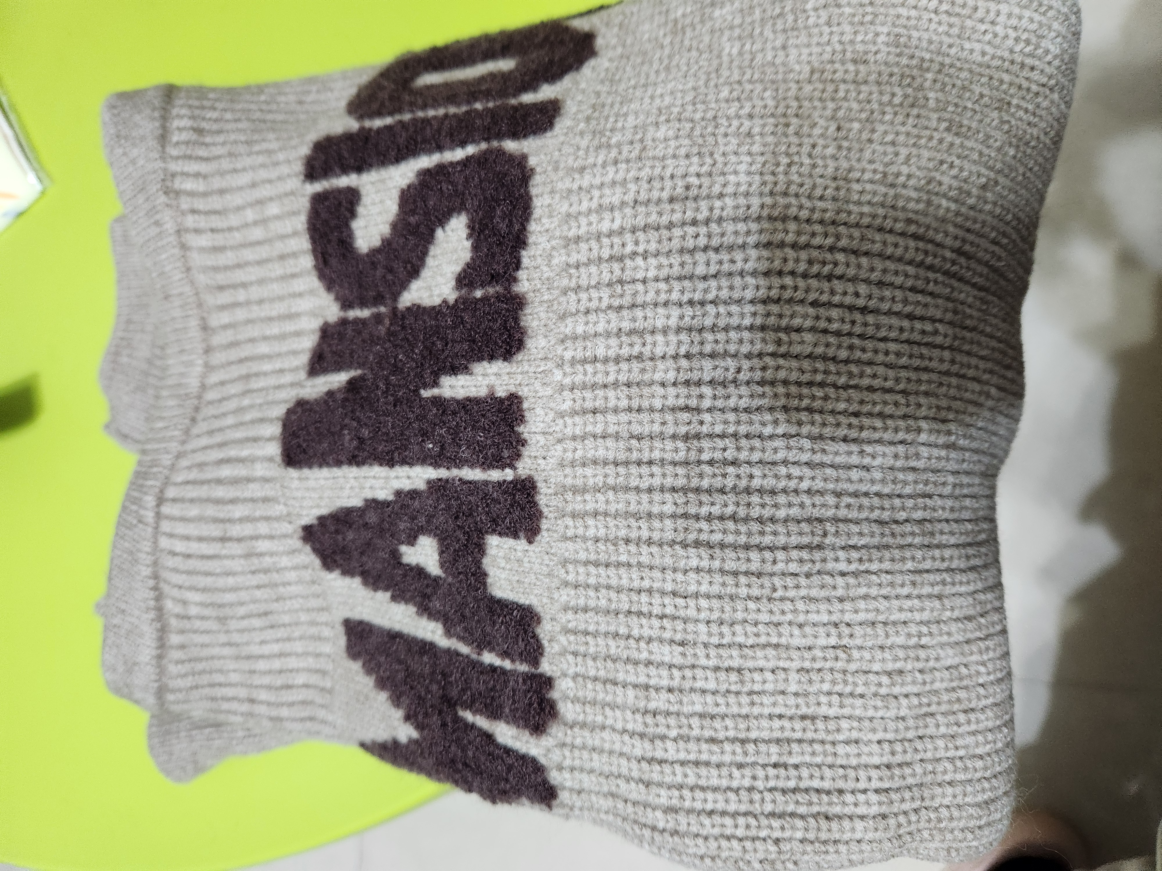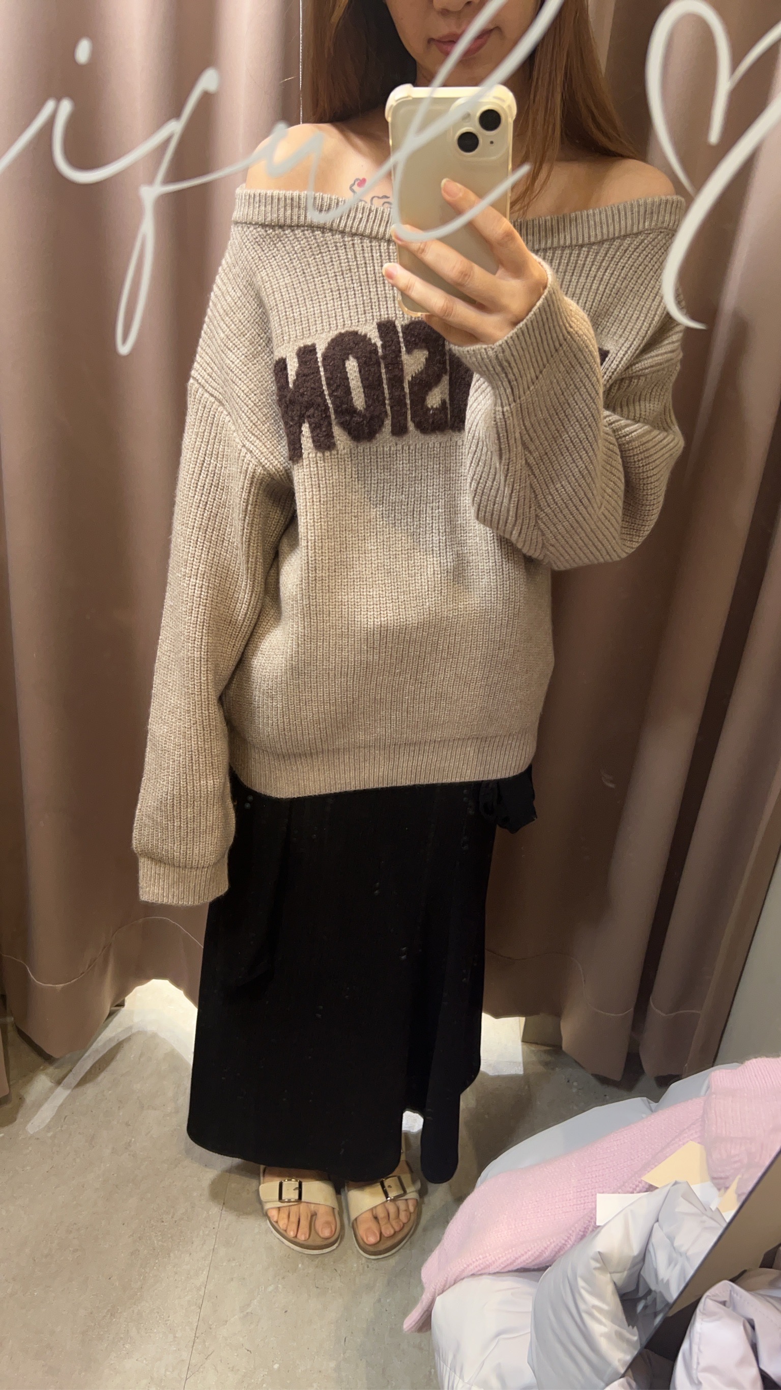 This mid-weight knit sweater is crafted with a dense texture that offers reliable warmth and a soft, skin-friendly feel. The wide round neckline allows for versatile styling, worn on the shoulders or pulled slightly off one shoulder for a relaxed look. Finished with bold knitted jacquard lettering at the chest and a loose drop-shoulder silhouette, it creates an easygoing, laid-back mood with a casual edge.