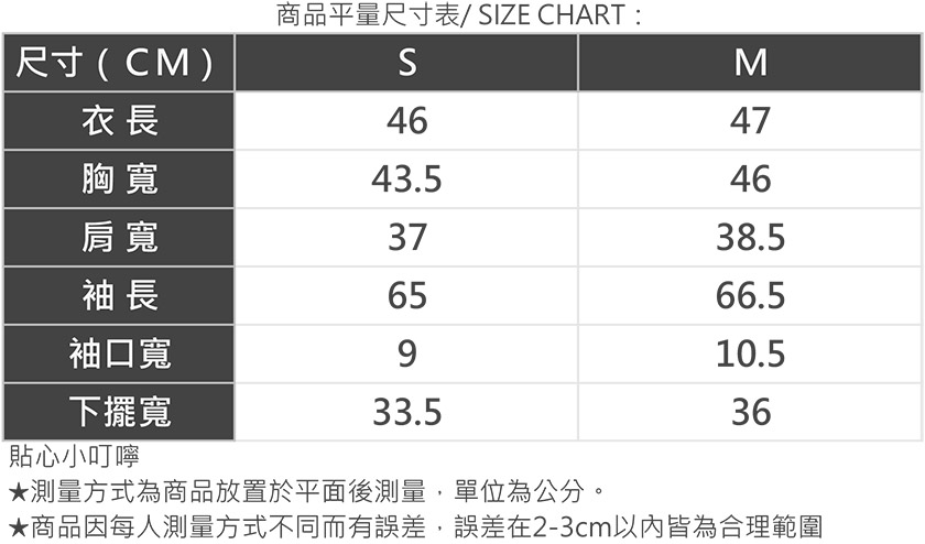 | 版型 | 貼身 | 1 | 2 | 3 | 4 | 5 | 寬鬆 |