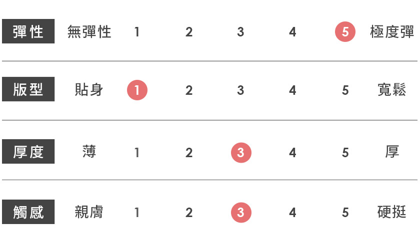 | 彈性 | 無彈性 | 1 | 2 | 3 | 4 | 5 | 極度彈 |