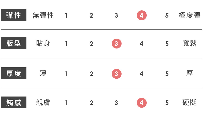 | 觸感 | 親膚 | 1 | 2 | 3 | 4 | 5 | 硬挺 |