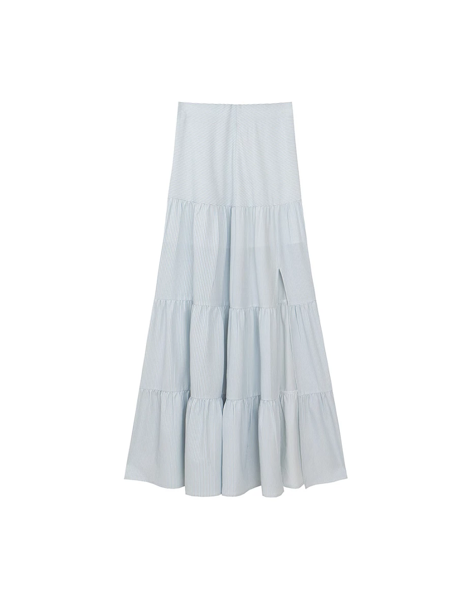Ruched Striped High Waist Tiered Maxi Skirt with Slit Detail