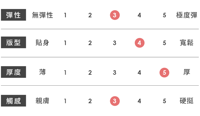 觸感 | 親膚 | 1 | 2 | 3 | 4 | 5 | 硬挺 |