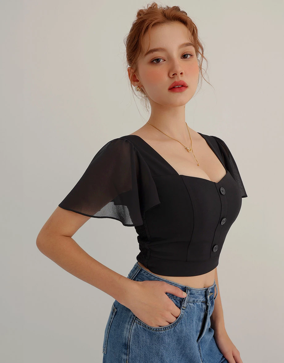 Chiffon Flare Sleeve Front Buttons Padded Crop Top