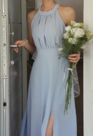 Elegant Halter Neck Pleated Padded Maxi Dress with Side Slit and Flowy Hem