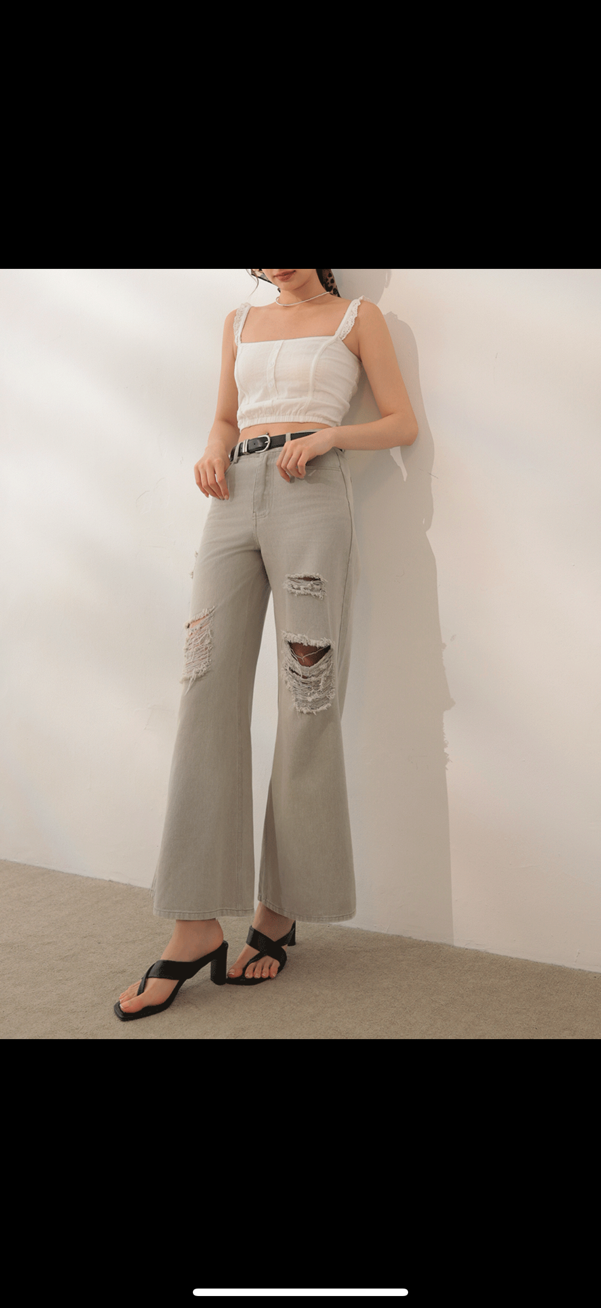 Raw Hem Distressed Detailed Wide Jeans Denim Pants with Belt