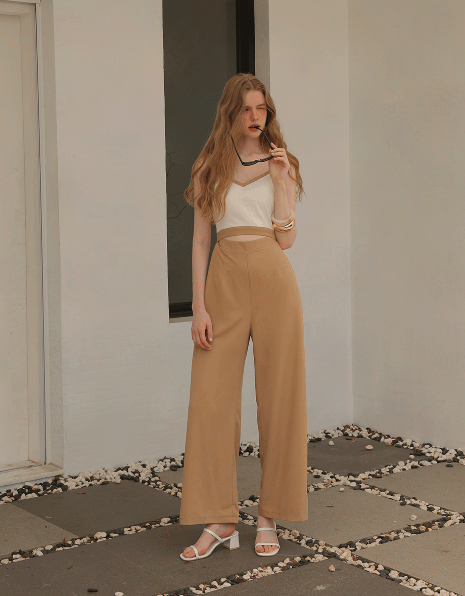 Faux 2 Piece Contrast Spaghetti Strap Waist Cut Out Wide Leg Padded Jumpsuit