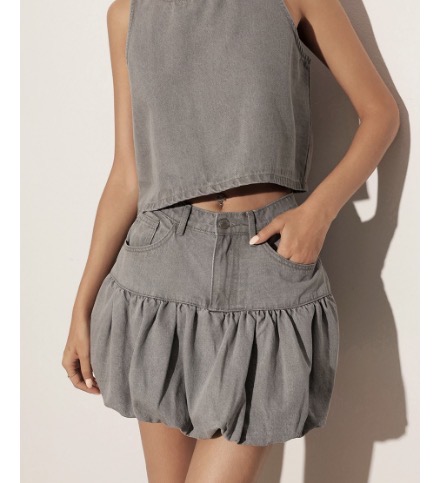 牛仔拼接花苞短裙