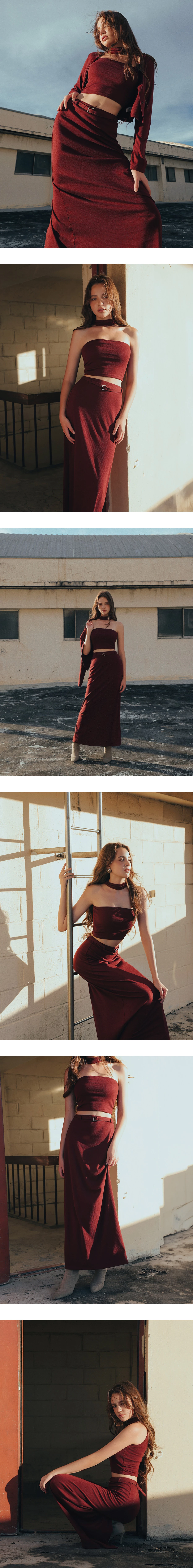 後開衩鬆緊直筒長裙(附品牌LOGO刺繡腰帶)