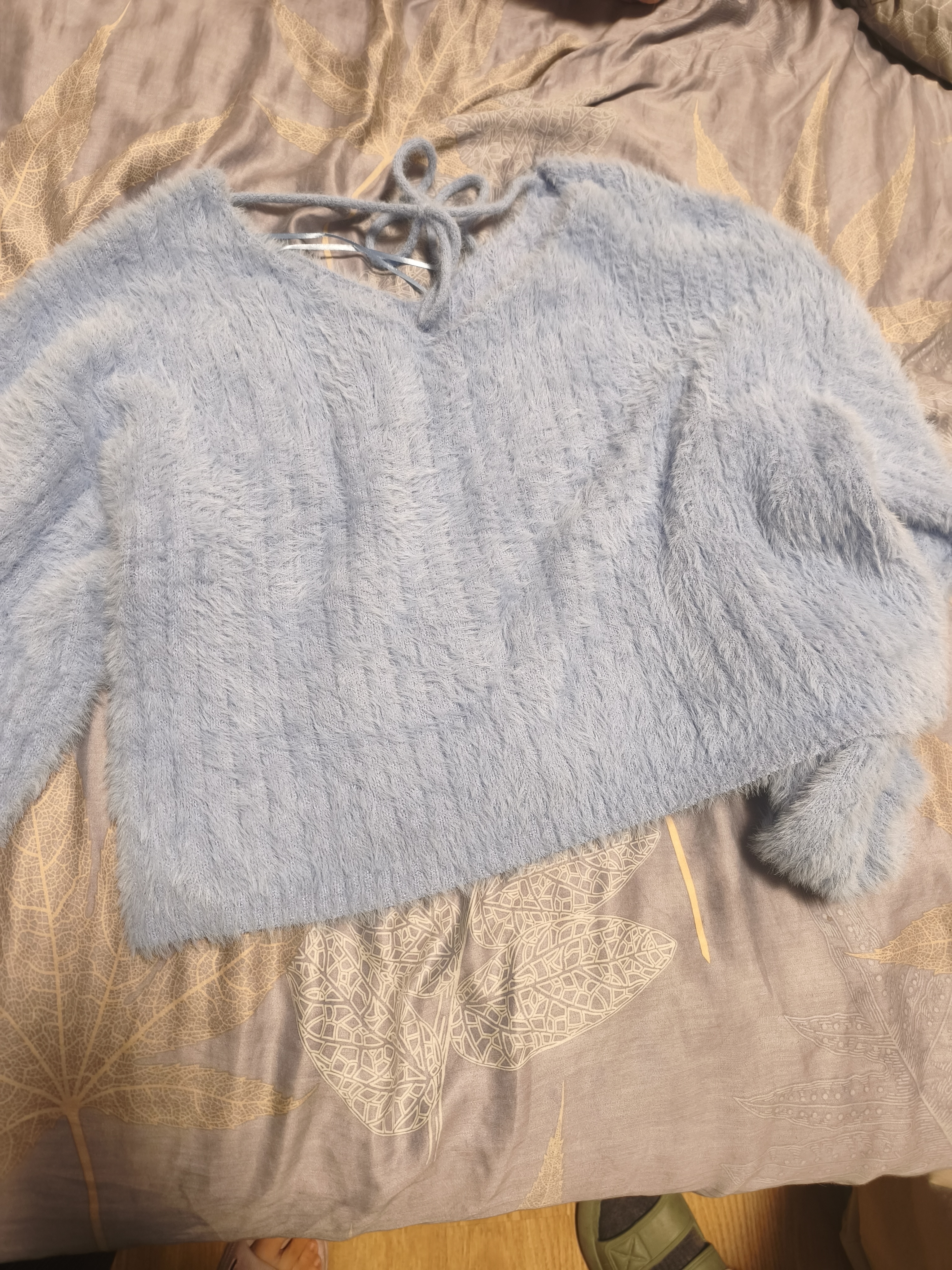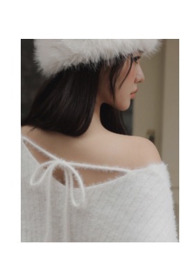 This reversible V-neck faux-fur knit top features a soft, fluffy texture and delicate tie detail, offering versatile styling with a light, cozy feel. The front-and-back wearable design adds flexibility to everyday outfits, while the cropped silhouette keeps the look clean and modern—breaking away from the bulkiness often associated with knitwear.