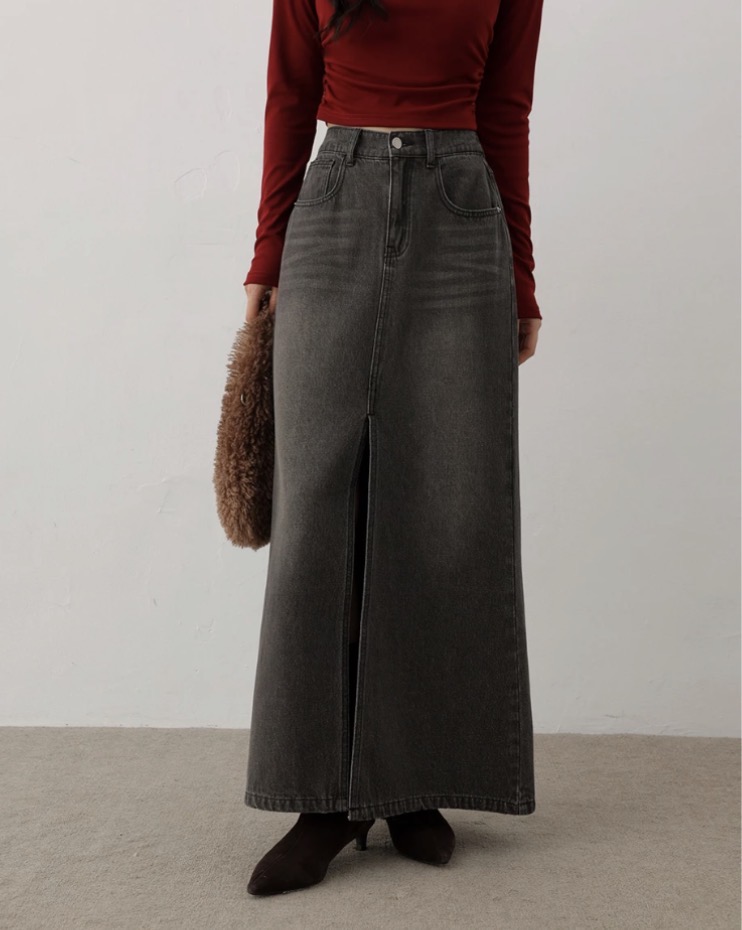 Front Slit Vintage Wash High Waist Jeans Denim Mermaid Maxi Skirt