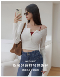 【Heat Tech】Basic Button Front Scoop Neck Cropped Long Sleeve Top