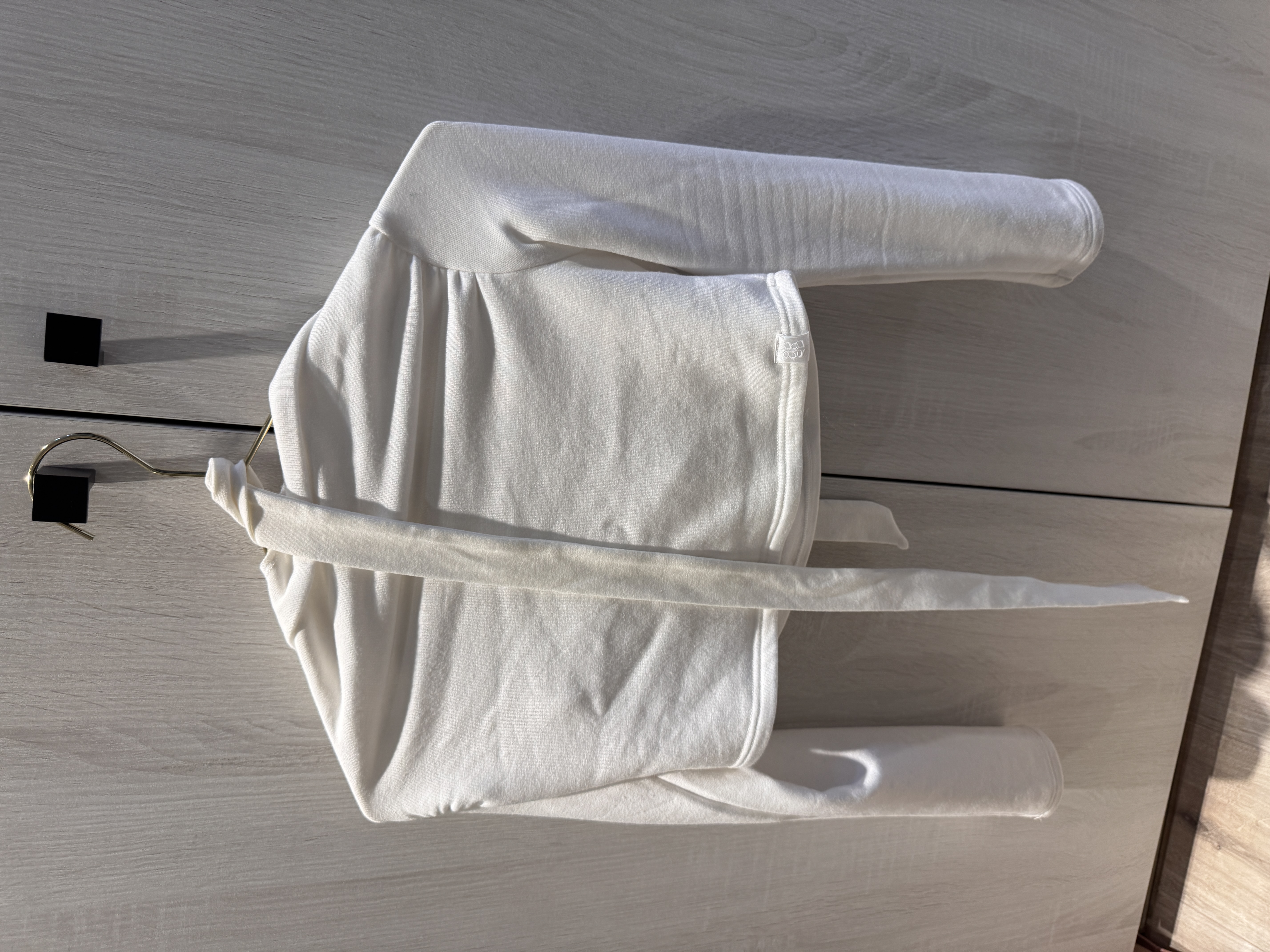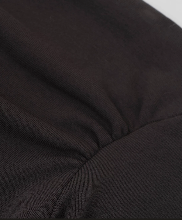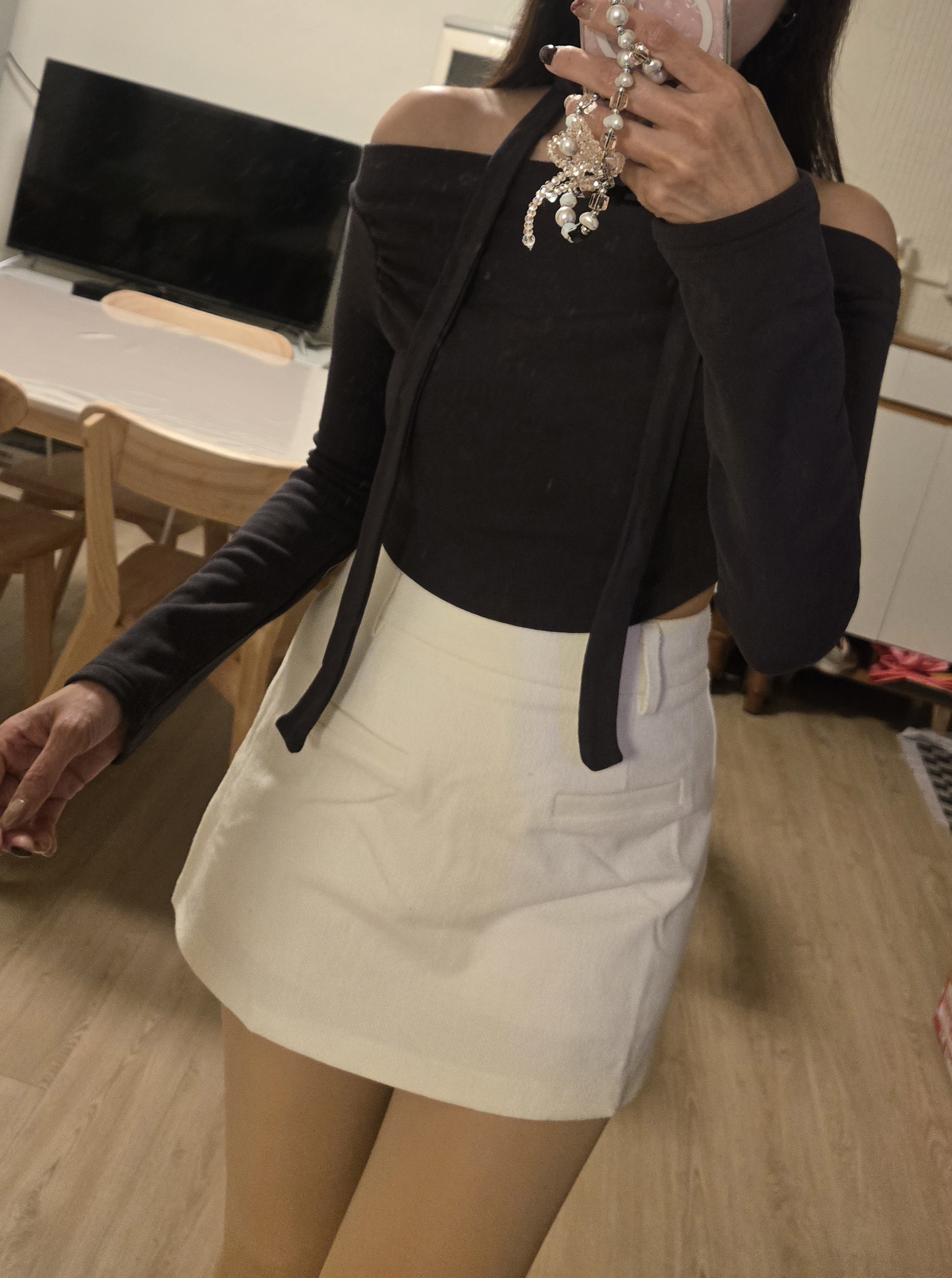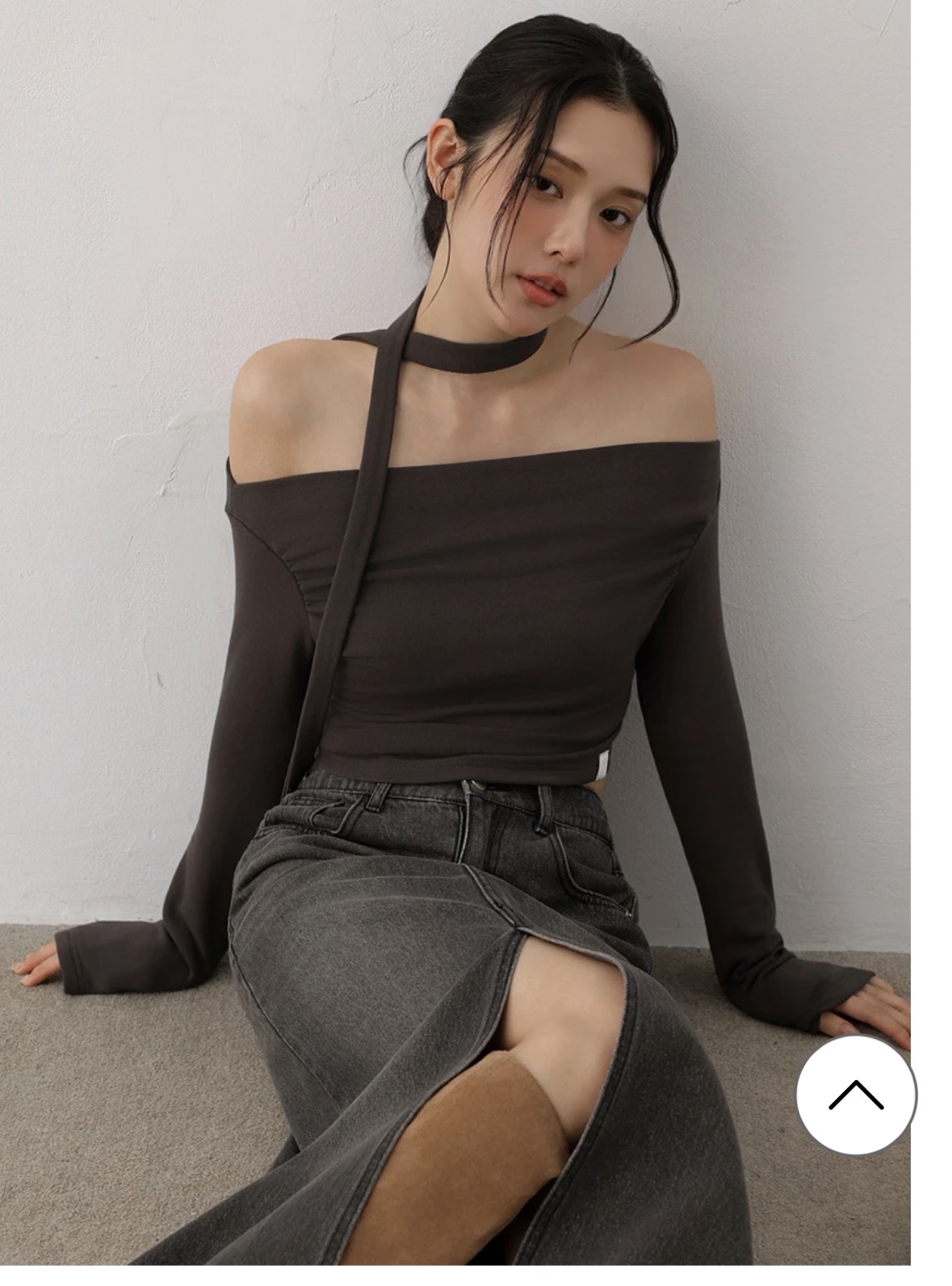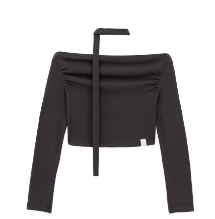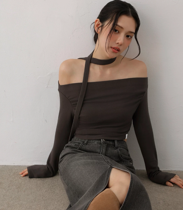 This off-the-shoulder top features subtle ruching that naturally highlights the collarbone and shoulder lines. The brushed inner layer offers a soft, warm feel against the skin. A detachable scarf adds styling versatility, allowing you to create a confident, feminine look with a relaxed edge.