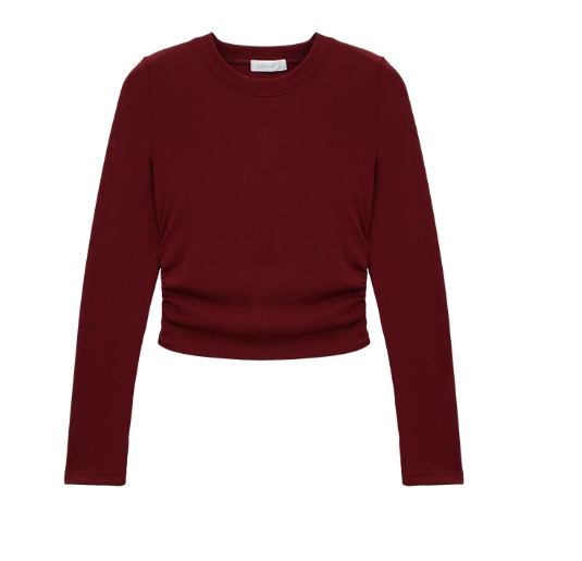 This classic crew-neck top is designed with side ruching that helps define the waist for a slimming look. The stretchy fabric follows the body comfortably, while the cropped length raises the visual waistline. Paired with high-waisted bottoms, it creates a clean, elongated leg silhouette with minimal effort.