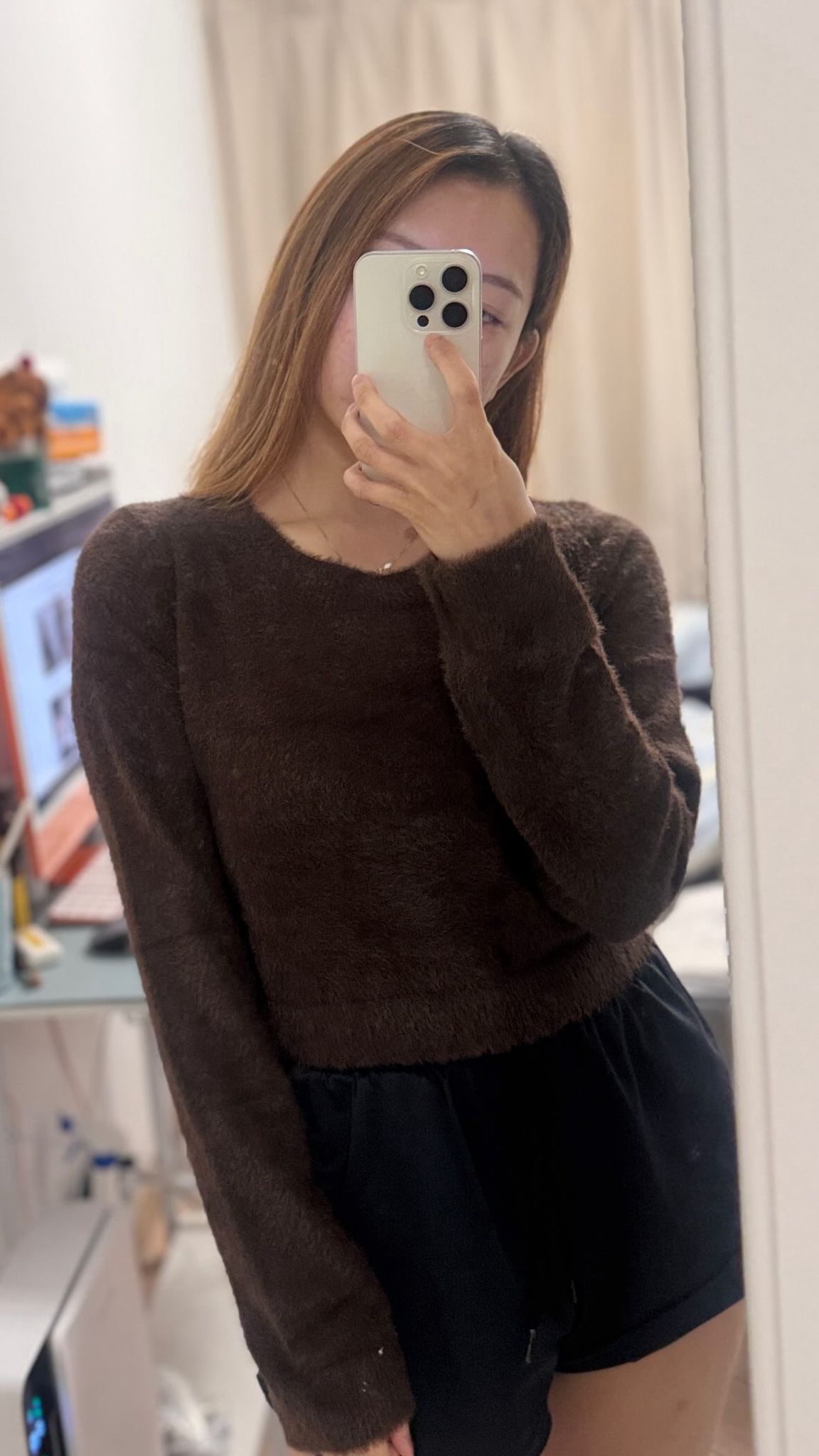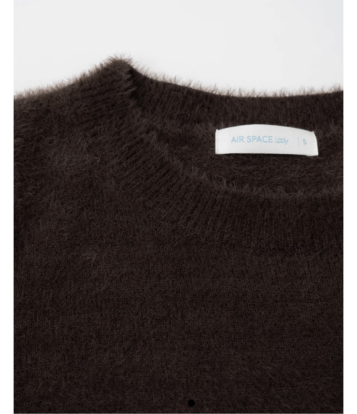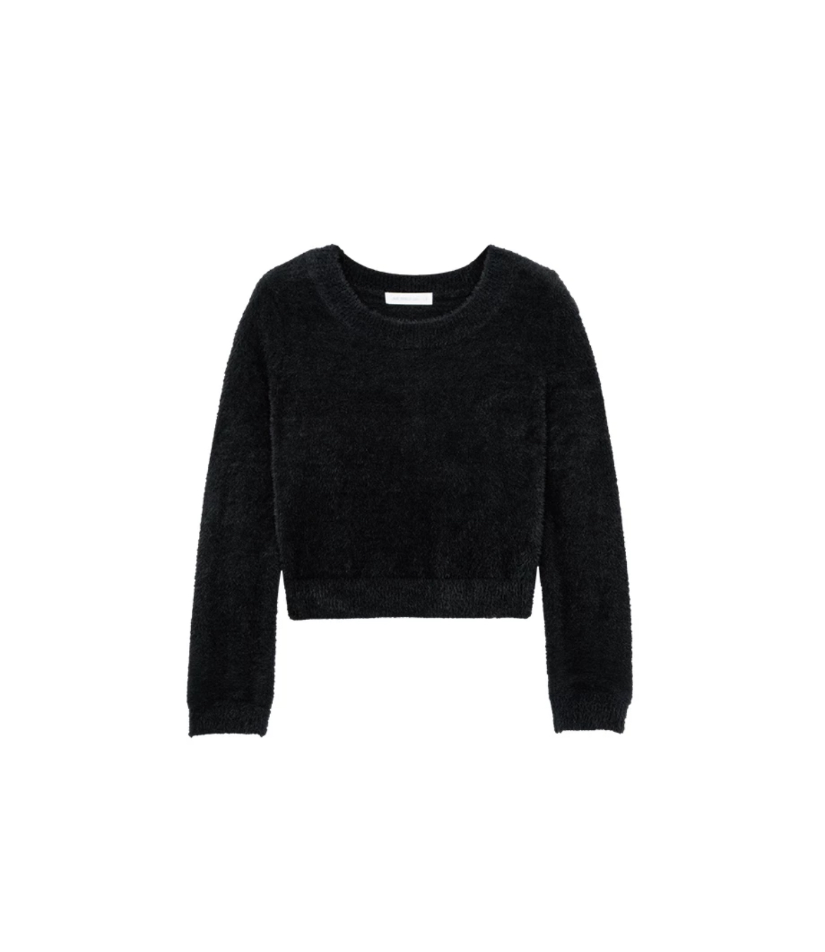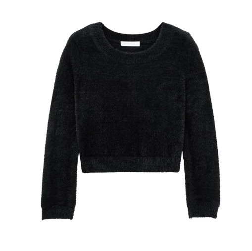 This faux mink knit features a plush, voluminous texture with excellent thermal retention for consistent warmth. The clean round neckline is paired with a sharp cropped silhouette that defines the waist and enhances lower-body proportions. Designed with fitted long sleeves, it delivers cozy comfort while maintaining a light, streamlined look, making it a refined choice for elevated everyday winter styling.