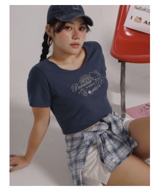 Product Description: Fitted cropped silhouette / Vintage print design / Text print at back hem