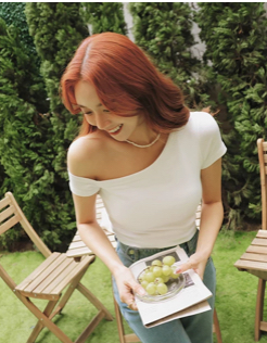 不對稱斜肩領短袖短版上衣(附胸墊)